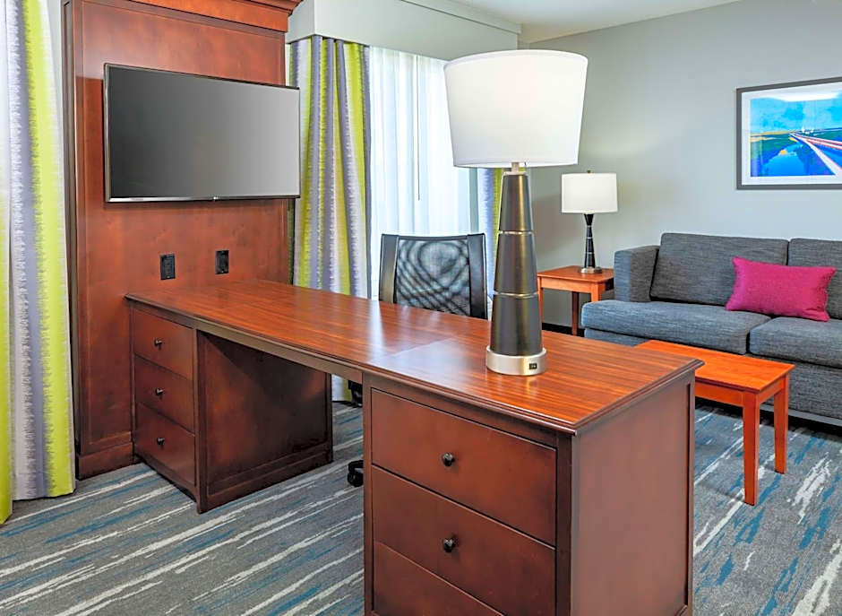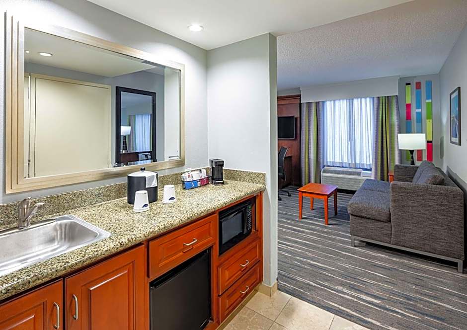 This accessible studio features a small refrigerator and seating area with a sofa bed.